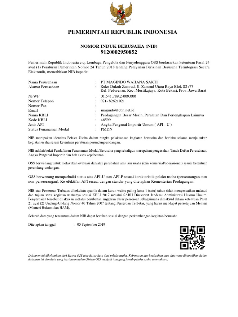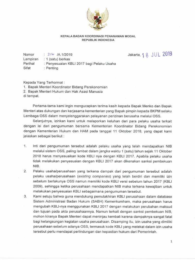 Oktober 2019 dengan berlakunya sistem OSS Versi 11 maka untuk memperoleh NIB dan Izin Usaha melalui platform OSS maka pelaku usaha wajib menyesuaikan maksud dan tujuan dengan format KBLI 2017. OSS - Sistem Perizinan Berusaha Terintegrasi Secara Elektronik.